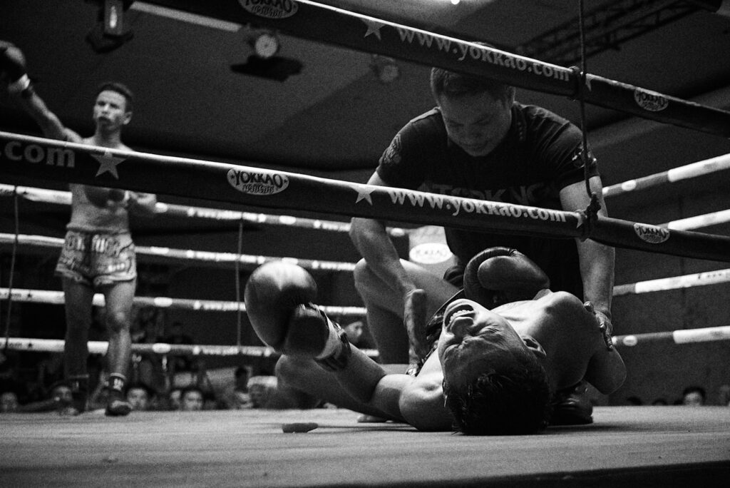 撮影者コメント:タイ プーケットの場末の格闘。席を立って許可を得てリングサイドに陣取り、選手の汗を浴びながら 手動焦点・F値開放で私も汗をかきながら格闘しました。