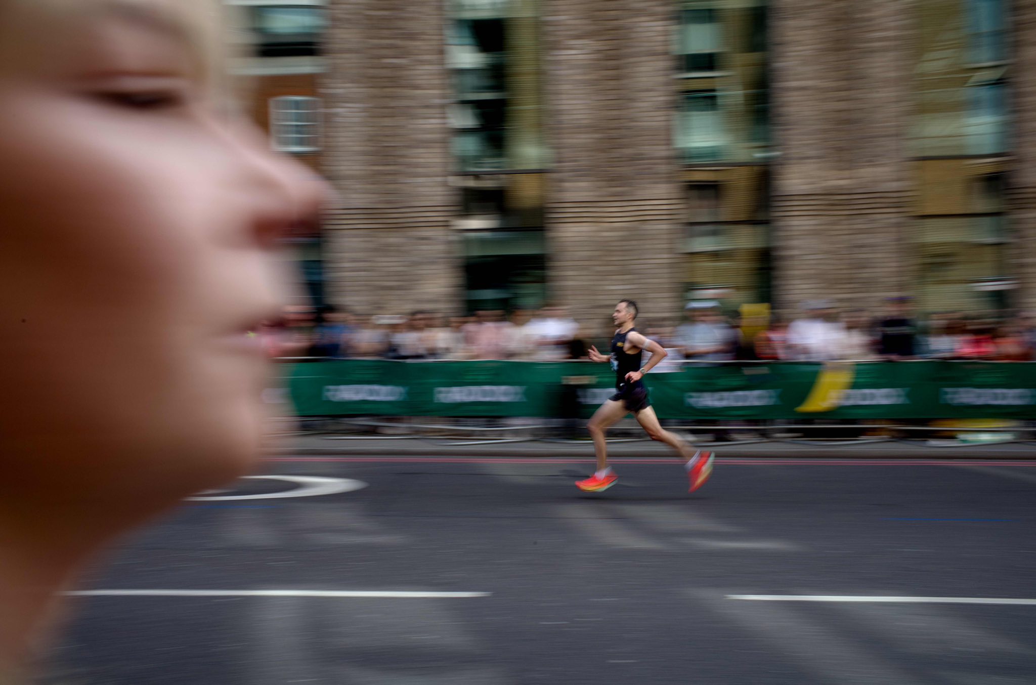 撮影者コメント:今年4月のロンドンマラソン。力強く坂道を走るランナーを流し撮りしてみました。左側に手前で応援していた人が入り込んでしまい面白さが加わりました。