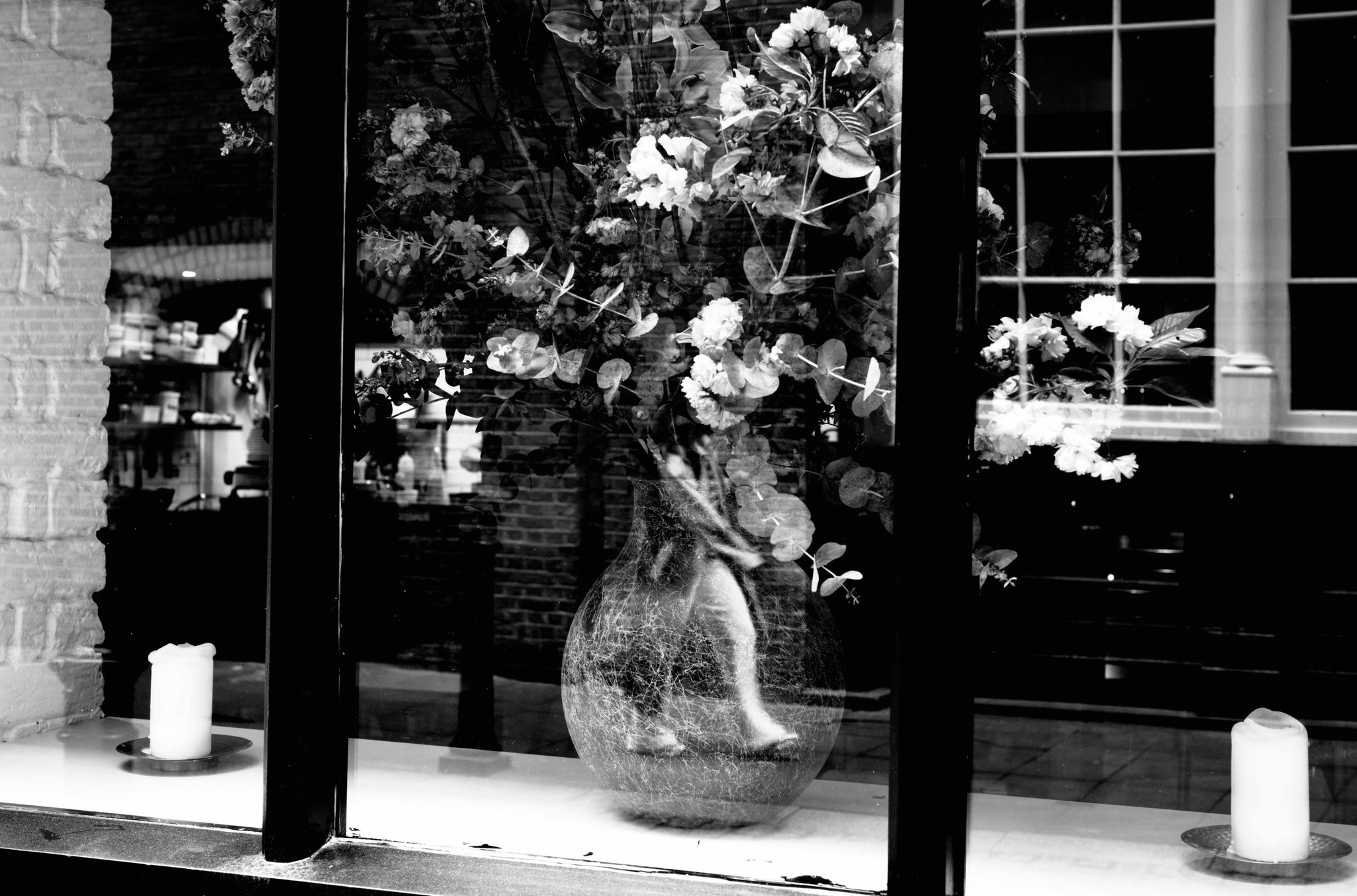 撮影者コメント:近所を散歩中、とあるお店の窓際に置かれた花瓶に、歩道を歩く人が映り込むのを見つけ、タイミングを見計らって撮ってみました。