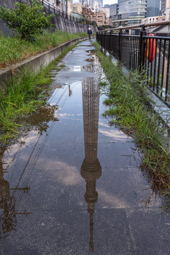 撮影者コメント:蔵前から浅草に流れる川の遊歩道で雨上がりの長く大きな水たまりを発見、小さな人と大きなツリーを比較したくて、人が来るのを結構待ちました。