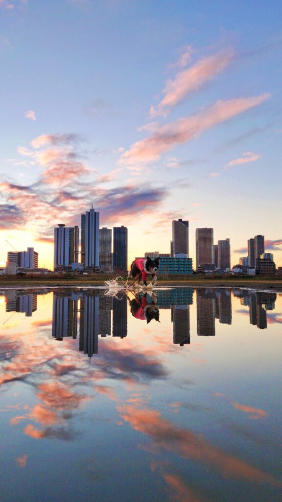 撮影者コメント:雨上がりの河川敷を散歩中、水たまりで遊んでいるときの一枚です。