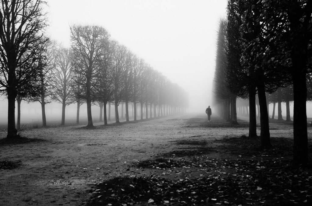 ・霧の中に向かって歩いている人物から物語性を感じます。
