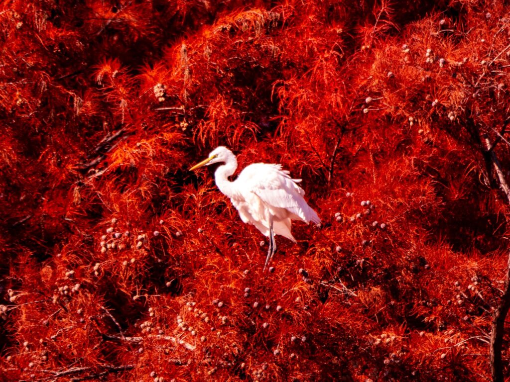 撮影者コメント:11月24日埼玉県別所沼公園で撮影した一枚。紅葉した落羽松(ラクウショウ)の木に真っ白な鷺が飛んできて、その赤と白のコントラストに惹かれて撮りました。