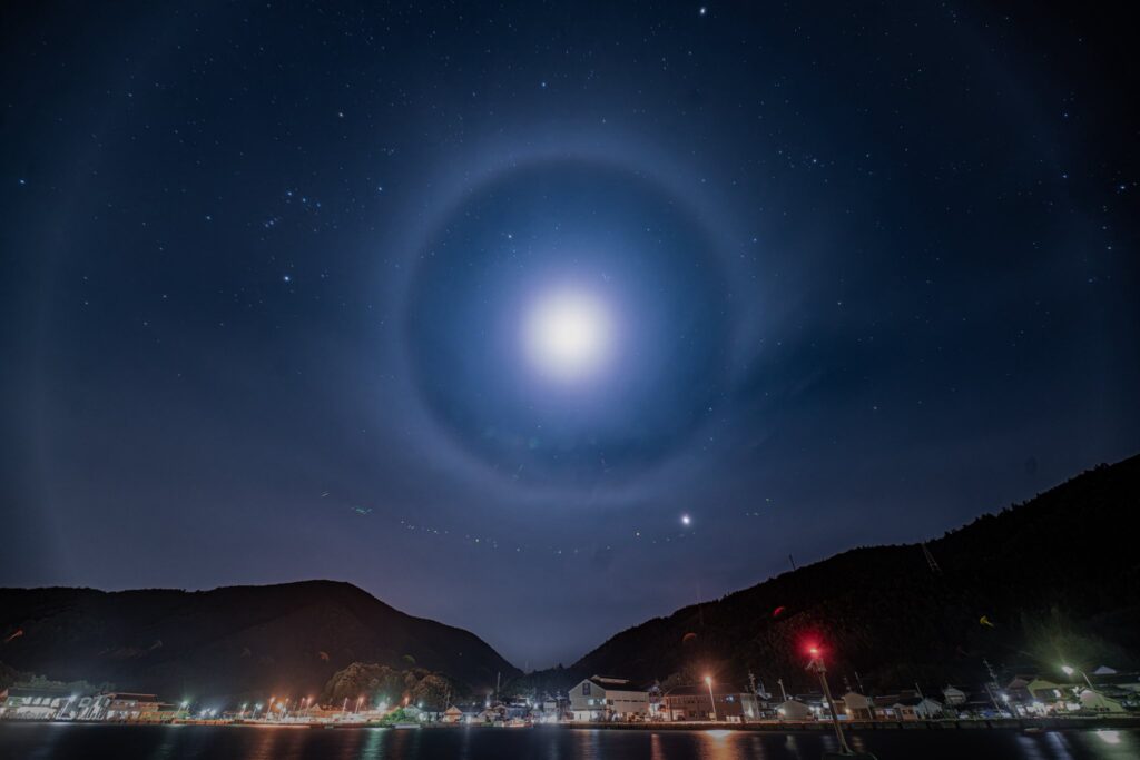 撮影者コメント:隠岐諸島で撮った写真です。たまたま月暈が出ていてまるで隠岐諸島を守っているように感じました。結構国境離島って大変らしくって、日本を守るための島でもあるそうです。その島を守るためにもこの月暈が出たのかなと感じました。